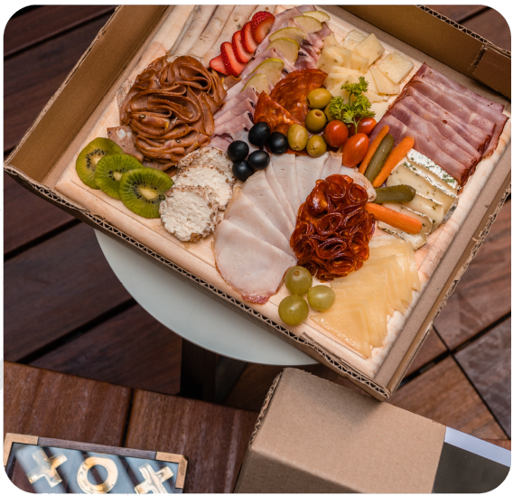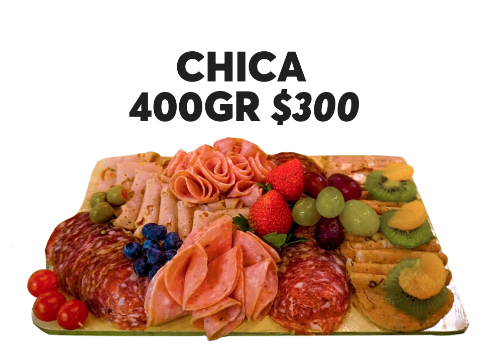 400gr de producto 4 carnes (100gr c/u) a elegir de nuestro catálogo. Incluye tabla chica de regalo. Decorada con fruta y verdura Emplayada en Vitafill, cubierta de papel aluminio.