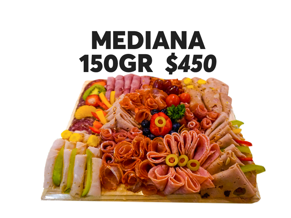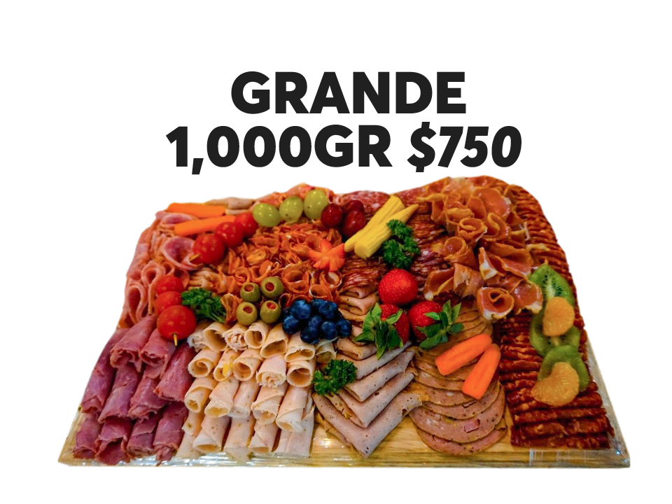 5 carnes (110gr c/u) y 2 quesos a elegir (100gr c/u) a elegir. Decorada con fruta y verdura. Emplayada en Vitafill, cubierta de papel aluminio.