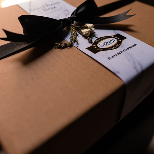 Empacada en caja de cartón con etiqueta, moño, flores y romero.